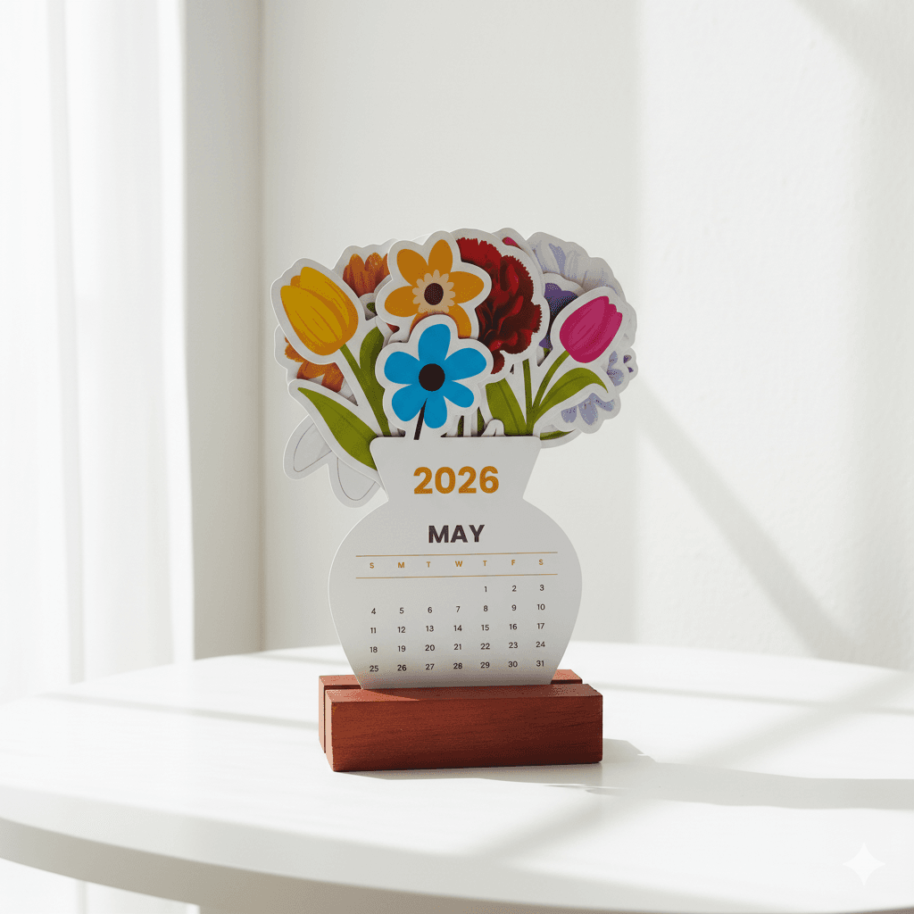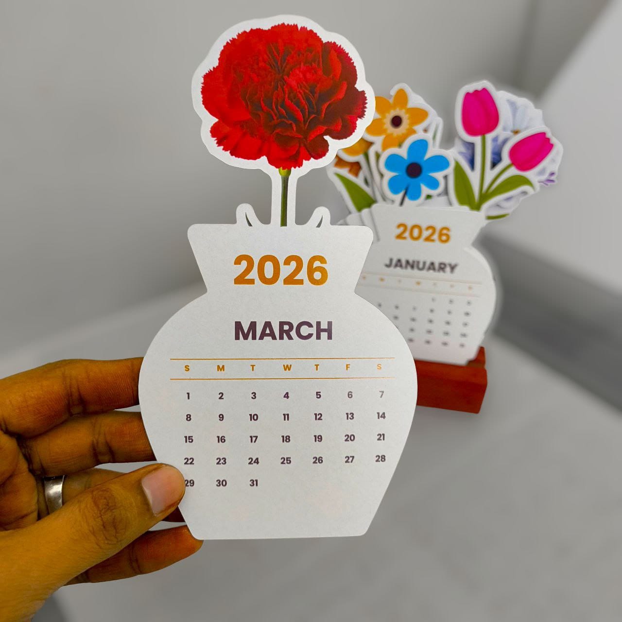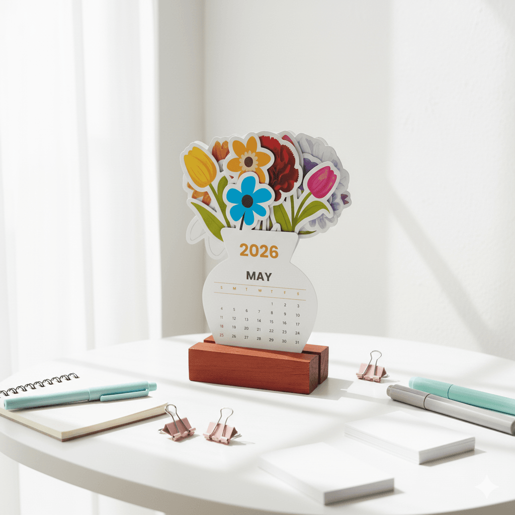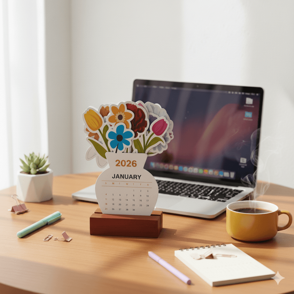 Bring a touch of freshness to your desk with this beautifully designed 2026 Flower Vase Desk Calendar. Each month comes as an individual card shaped like a vase, topped with a unique illustrated flower – making it not just a calendar, but a cute décor piece for your home, office, or study table.